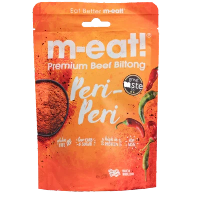 200g beef per 100g finished product biltong, black pepper, salt, coriander, cider vinegar, peri peri spice mix flavour