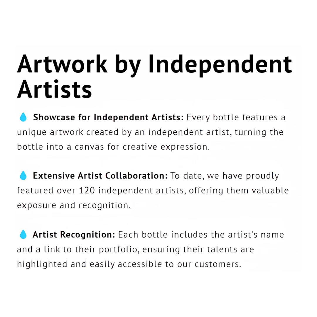 THE BOTTLES FEATURE ILLUSTRATIONS OF ARTISTS AND EACH BOTTLE CARRIES THE NAME OF & LINK TO THE ARTIST.